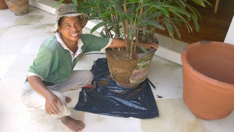 Der Gärtner Nyoman ist für die Pflege des Gartens zu den selben Zeiten anwesend. Auf Bali muss man weniger anpflanzen, um so mehr aber täglich Grünes zurückschneiden. Zu guter Letzt haben wir auch noch unseren Mamad, welcher drei Mal die Woche für 10 Minuten für die Poolreinigung zuständig ist. Er kommt immer dann, wenn man gerade ins Wasser springen will.